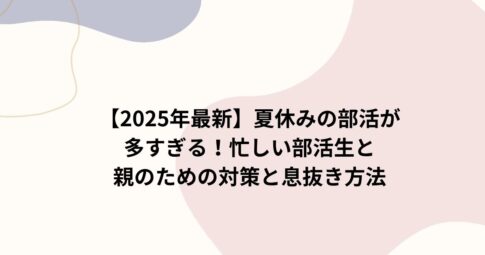 社会はじめに 夏休みの部活が多すぎる理由って、ちょっと気になりますよね。 実は、夏休みの部活が多すぎる理由は、「大会シーズンが重なる」「顧問や先輩の熱心な指導方針」「合宿や遠征が増える」 という3つが大きな原因です。この記事...