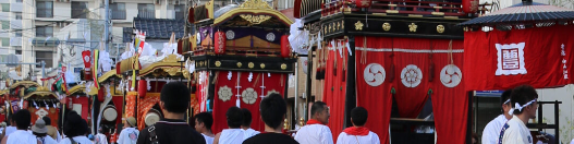 町内ごとに趣向を凝らした曳山(山車)が、太鼓とお囃子に合わせて街を練り歩きます。