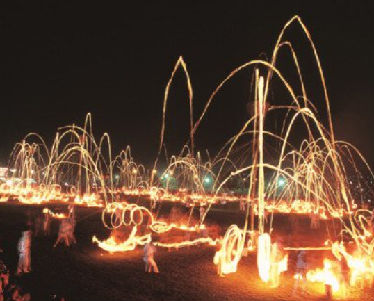 高さ11mの柱松点火競技や約2kmにわたる万灯籠、美しい炎の演舞とともに、フィナーレの約550発の花火まで、火と光のドラマをお届けします 。