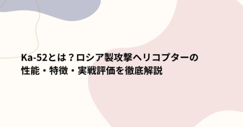 社会はじめに Ka-52は、ロシアの航空機メーカー「カモフ」が開発した高性能攻撃ヘリコプターです。 愛称「アリゲーター」の通り、強力な攻撃力と優れた防御性能を備えています。 本記事では、Ka-52の基本情報、設計の特徴、兵装...