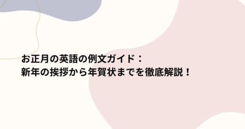 社会はじめに お正月の英語の例文で新年の挨拶や年賀状についてご紹介します。 お正月が近づくと、海外の友人に向けて新年の挨拶をしたいけれど、どんな英語を使えばいいか迷うことはありませんか? 「明けましておめでとう」や「今年もよ...